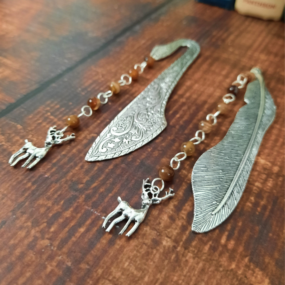 This elegant, handmade bookmark is the perfect gift for any book lover. The ornate metal bookmark, complete with a deer charm and brown agate beads, gives your literary experience a touch of magic. Just place it between the pages to hold your place. Choose between an engraved or feather bookmark end.
